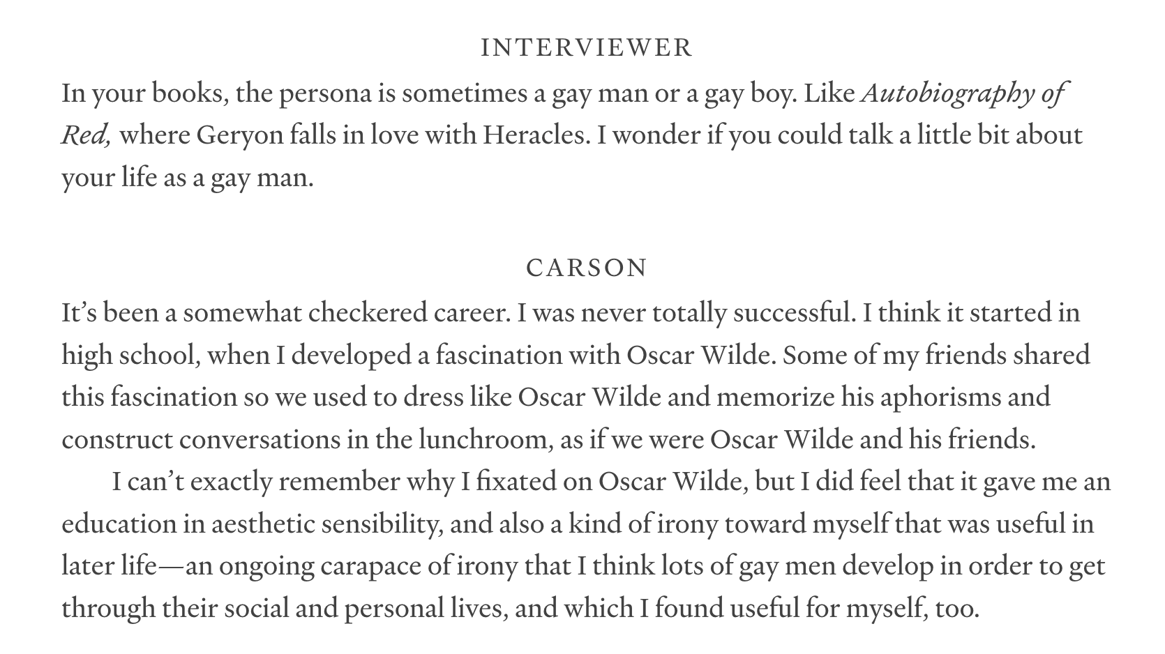 The moment I opened Autobiography of Red, I knew I would fucking love it. It is so specific, so whimsical, so tender without ever tipping into saccharine or melodrama. Erudite without pushing you out. The opening section gives you just enough grounding in the mythology it builds upon that, as the story unfolds, you feel a little bit like you’re shitting your pants — but step by step, you realize you are, in fact, prepared for the adventure.