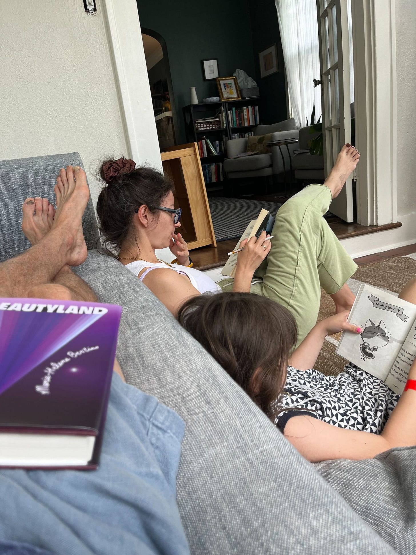 In our family, we’re all readers — but it took a while to get there. Now we end each day with what we call Family Reading Club. When my kid was little, we read to her every night. These days, we pile into her room and read our own books for twenty to thirty minutes before bedtime. It’s the sweetest ritual.