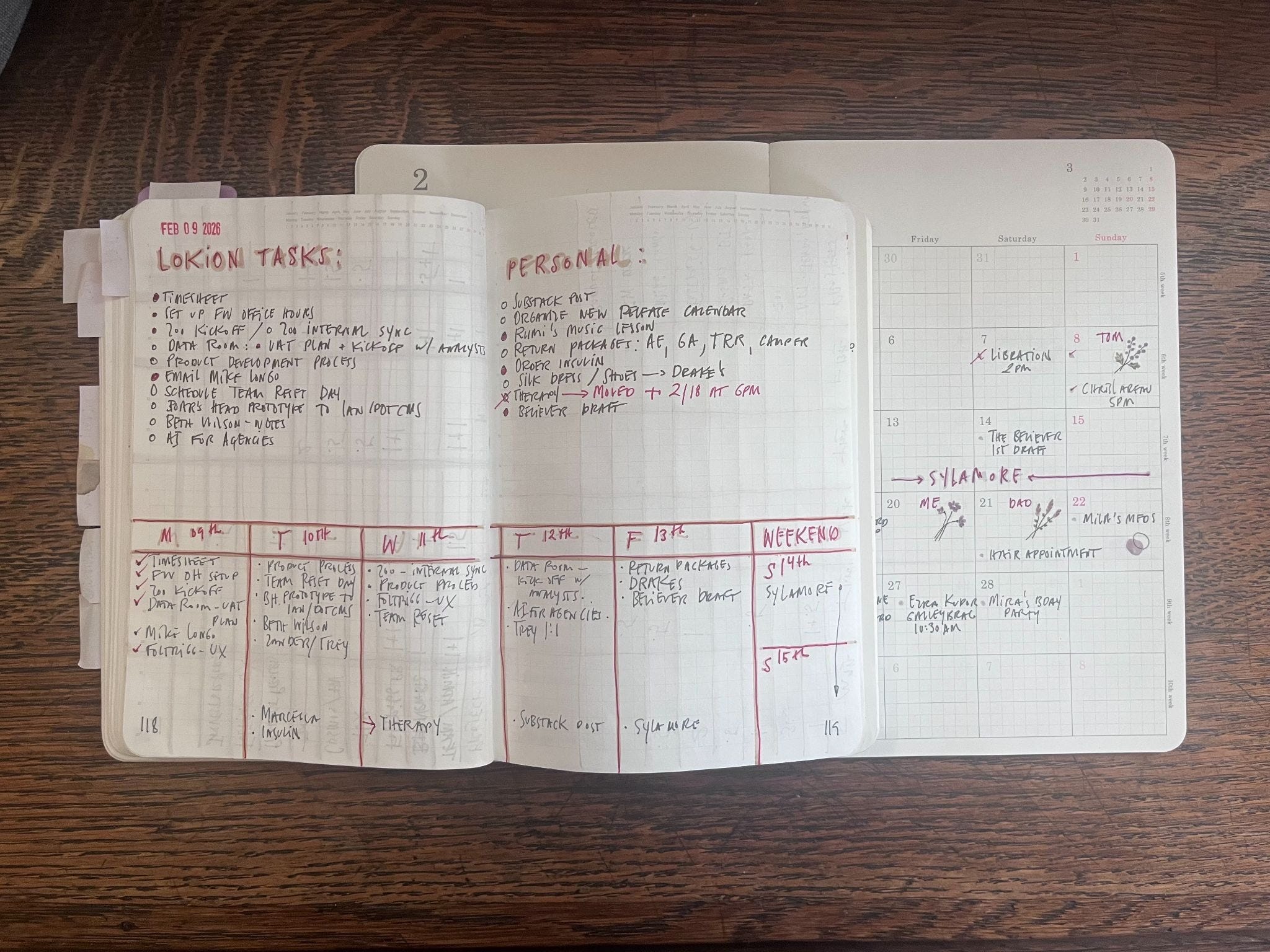 I made a February brain dump list with everything I needed to do for everybody (that’s THE LIST I mentioned in my organization post) . I’ve been pulling from that list to create focused weekly work and personal to-do lists. This weekly spread is followed by work notes, reading notes, Substack planning notes, and whatever else needs to live there. I number pages as I go. Anything I might need to reference again gets indexed in the back.